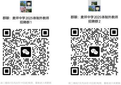 1.凡符合條件的有意者,請掃描下方二維碼進入“麥坪中學2025體制外教師招聘群1”(先進群1,如果群1滿了,再進“麥坪中學2025體制外教師招聘群2”,兩個群都一樣,請不要同時進兩個群)。